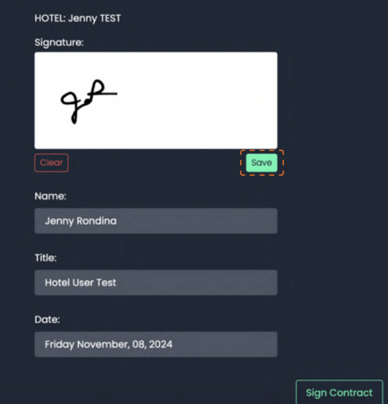 The last step is to sign the contract! To do so, simply use your trackpad, fill in the required fields, and hit the "Sign Contract" button.